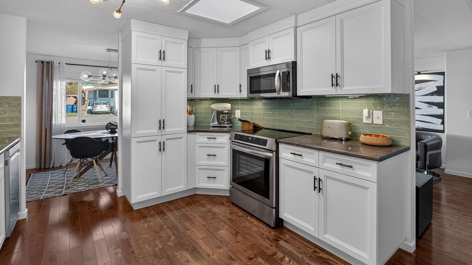 55+ Community. This one is a cream puff. Top quality renovations with a designer's touch. Nothing left to do but move in! Spacious with 3 nice sized bedrooms, 2 full bathrooms, large living room, dining room with enough space for friends and family. Beautiful yard with mature plantings, garden, partially fenced. Views of farmland, mountains and lake. Private yard for enjoying the Okanagan Sunshine and long warm seasons. Flooring, kitchen, bathrooms, painting, lights, appliances....all fairly new! Covered parking to protect the paint! and additional parking on the driveway for quests. Garden shed for the tools. No financing available. Cash buyers in this park!